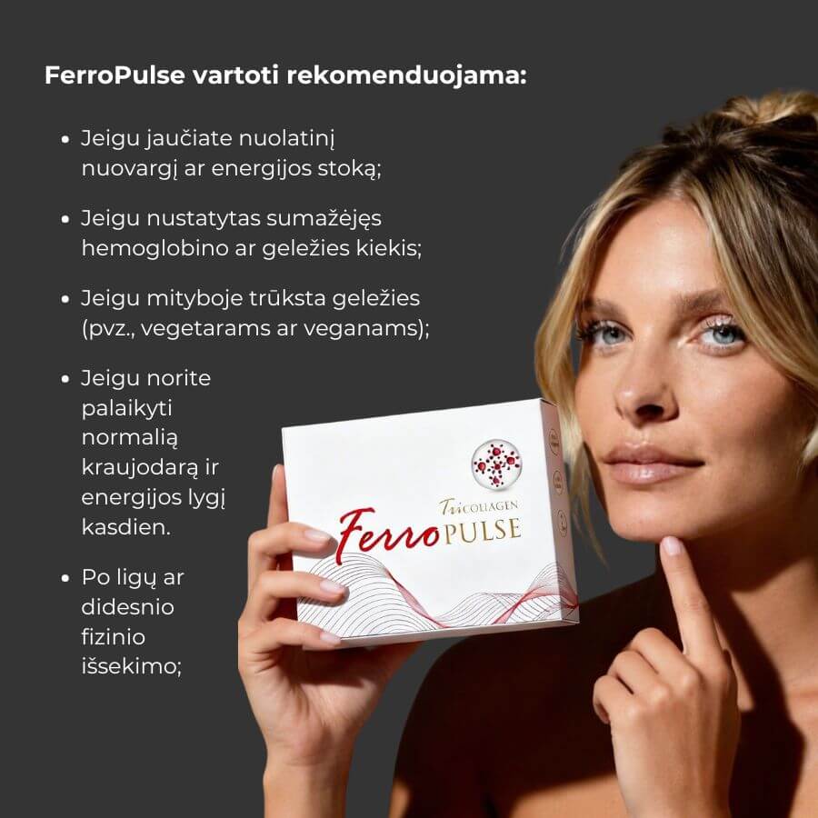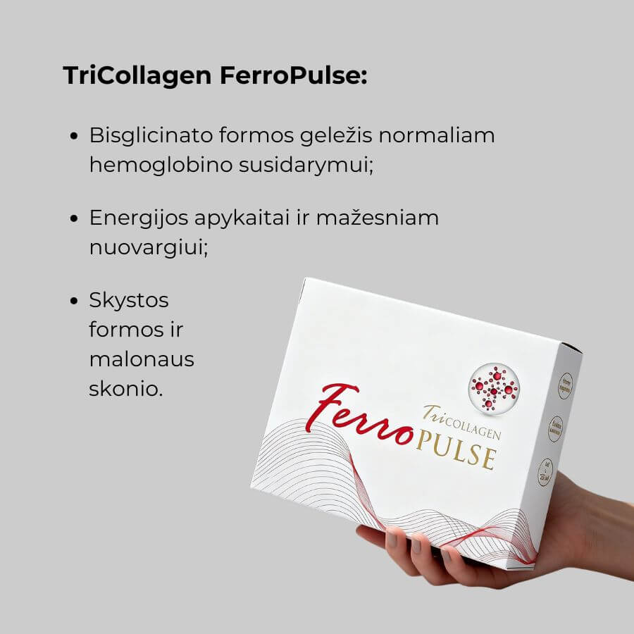 TriCollagen FerroPulse, sukurtas tiems, kurie ieško efektyvios paramos kraujui ir energijai kasdien. Skystos formos geležies produktas su itin didele veikliųjų medžiagų koncentracija, padedantis palaikyti normalią kraujodarą ir organizmo gyvybingumą. Jis prisideda prie raudonųjų kraujo kūnelių bei hemoglobino susidarymo ir efektyvaus deguonies pernešimo organizme, todėl padeda mažinti nuovargį ir palaikyti energiją.